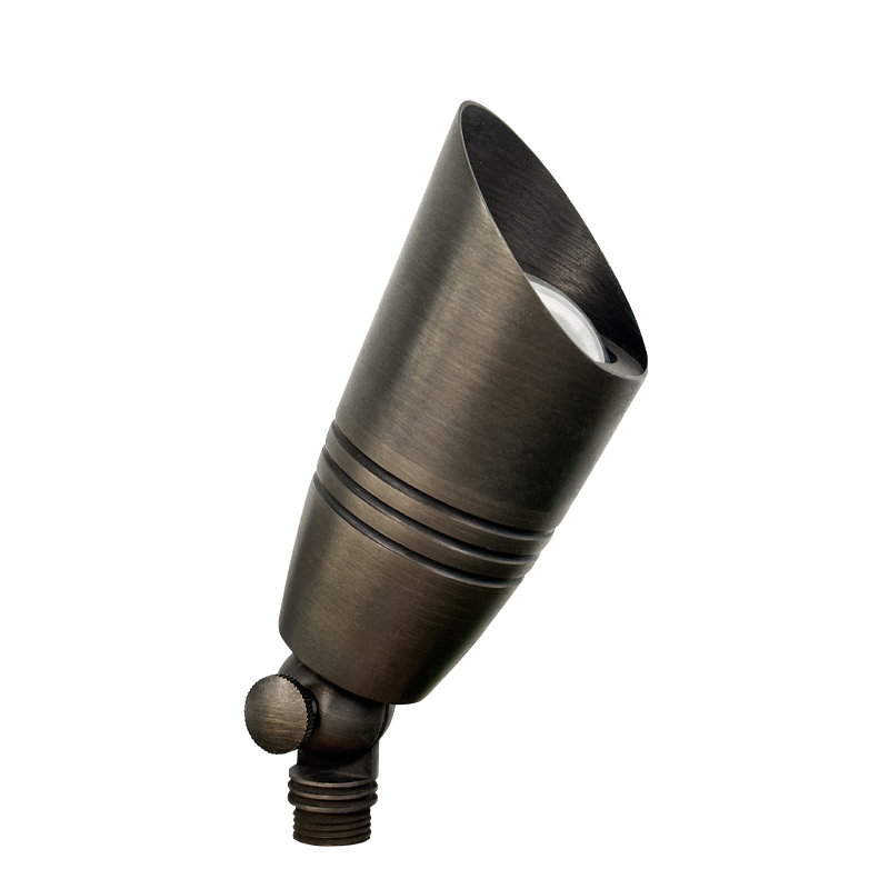 Brass is the powerful material to use in outdoor lighting fixture. Antique brass finish is nice and elegant. High tempered flat or convex glass lens can maximize the illumination for lighting trees or tall structures.